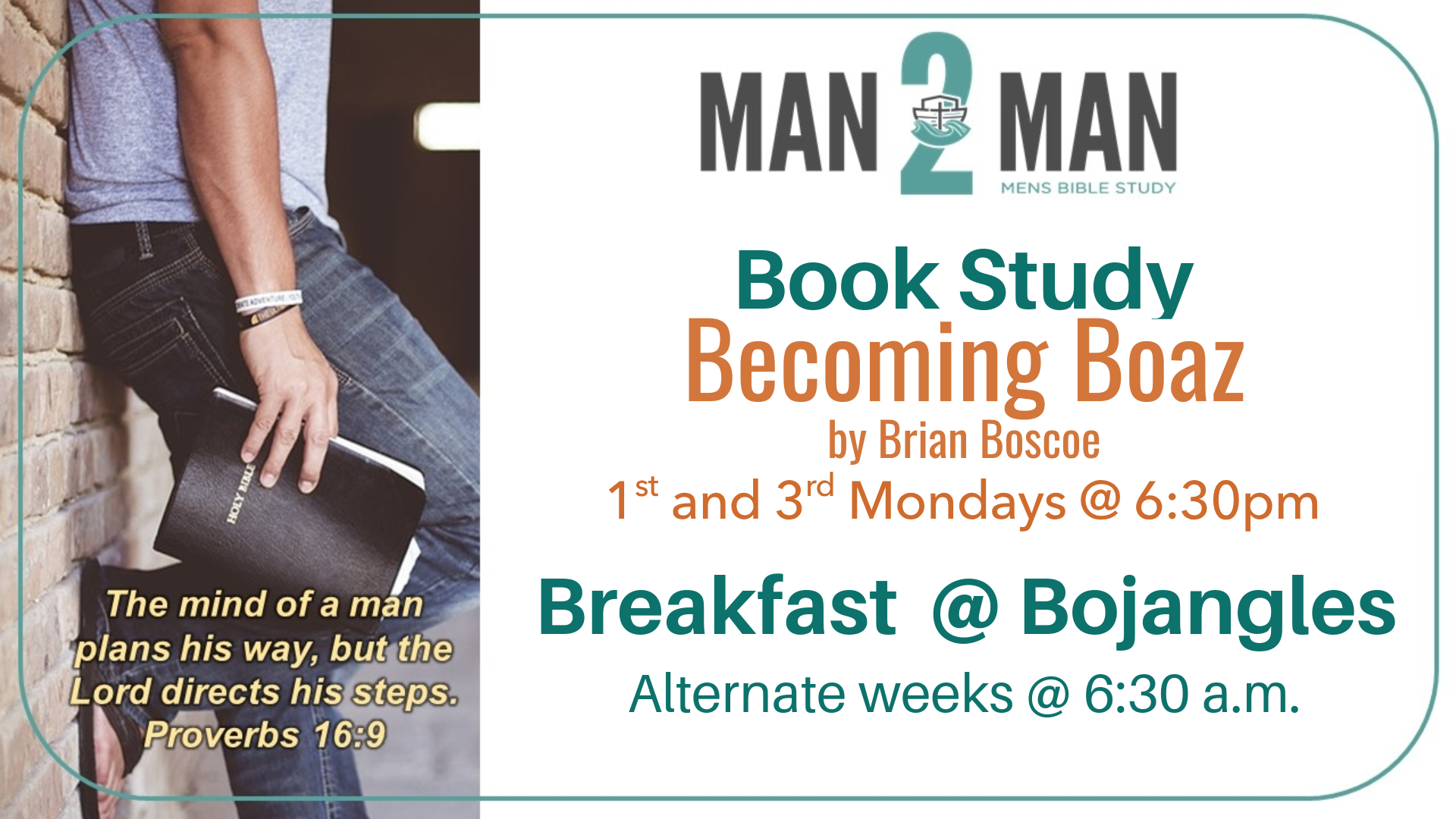 Man2Man meets the 1st and 3rd Mondays @ 6:30 pm at Genesis. Bring your your Bible.